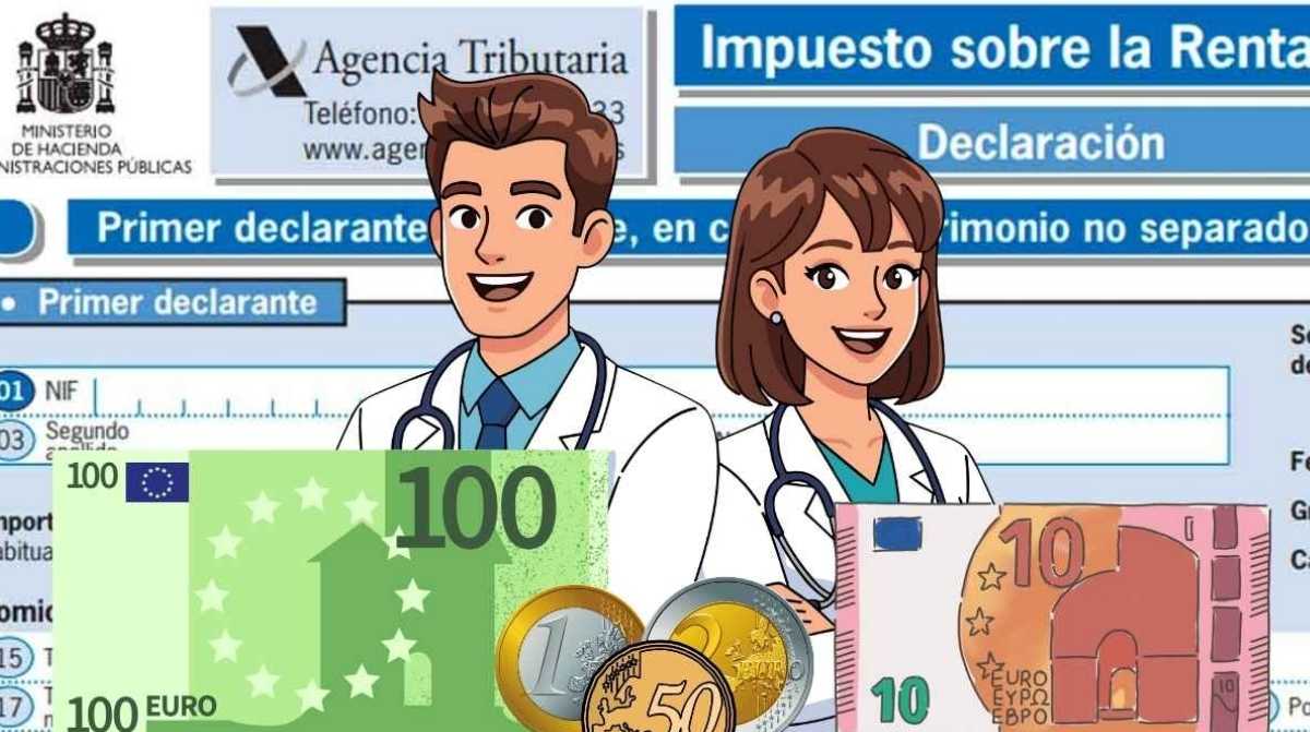Médicos con billetes en euros frente a un borrador de la declaración de la renta de Hacienda